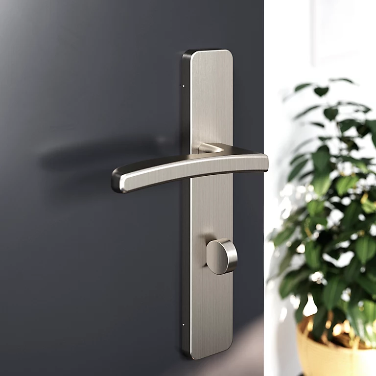 Ensemble poignée sur plaque rectangulaire à condamnation GoodHome Irvil effet nickel satin gris L.126.5mm x l.42mm entraxe 165-195mm