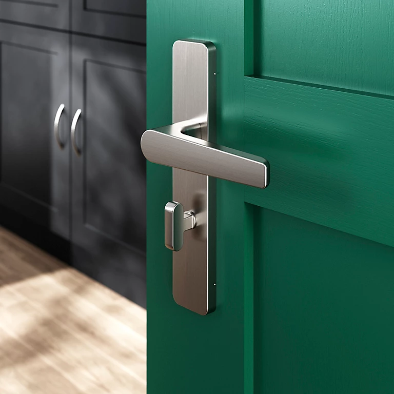Ensemble poignée sur plaque rectangulaire à condamnation GoodHome Kerver effet nickel satin gris L.128mm x l.42mm entraxe 165-195mm