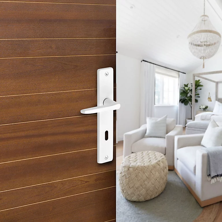 Ensemble poignée sur plaque rectangulaire serrure Colan satin blanc L.106mm x l.39.8mm entraxe 195mm