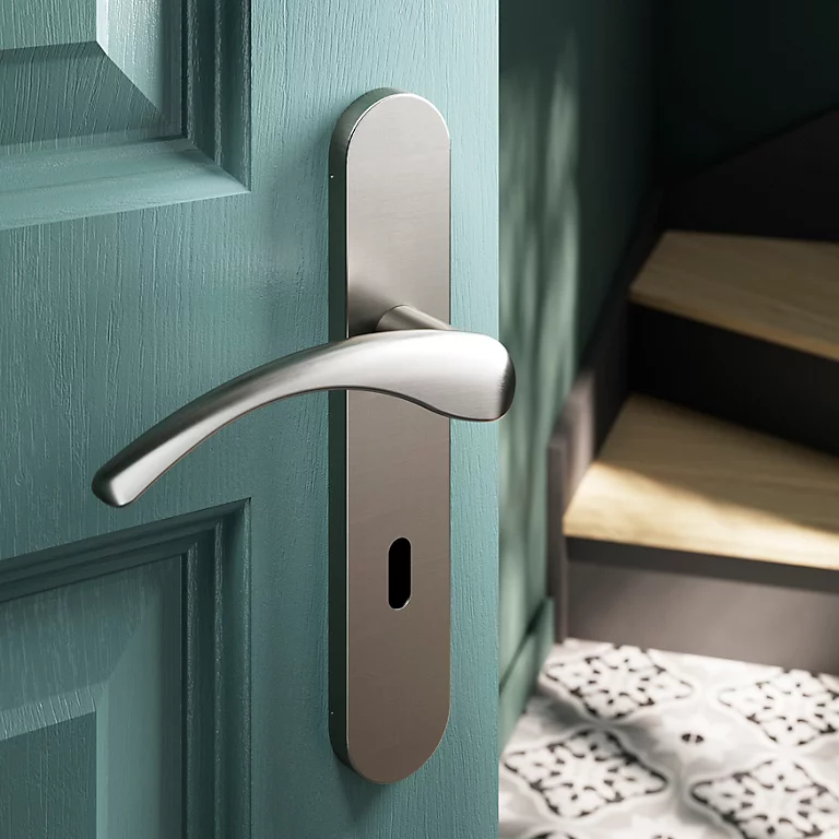 Ensemble poignée sur plaque rond serrure GoodHome Ruis effet nickel satin gris L.138.5mm x l.42mm entraxe 165-195mm
