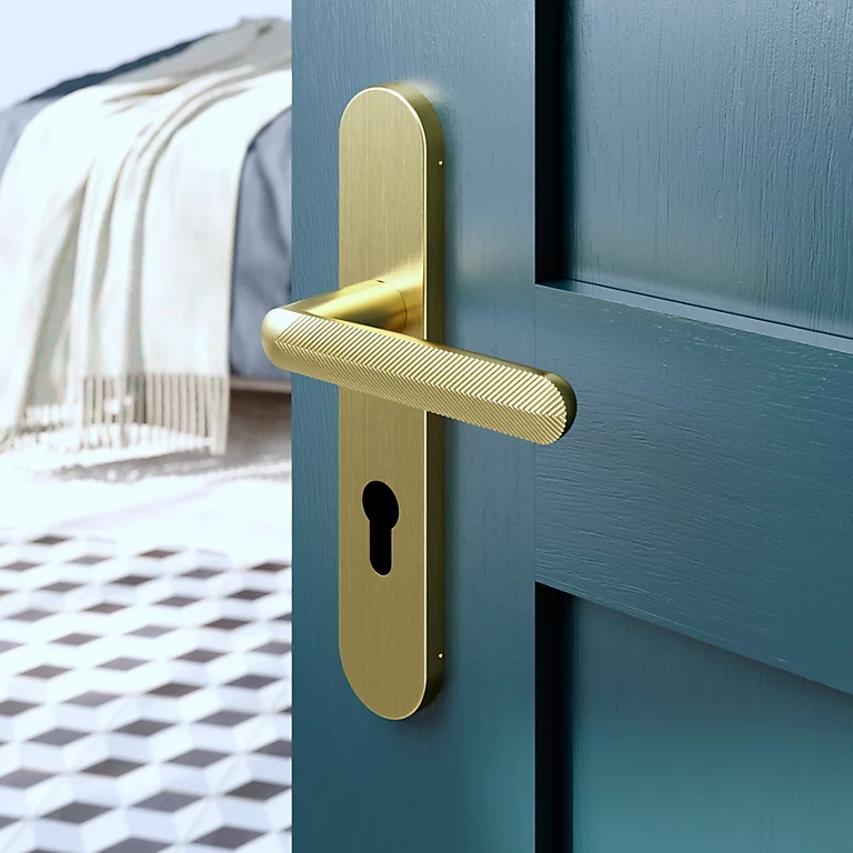 Ensemble poignée sur plaque rondcylindre GoodHome Garlan effet laiton satin doré L.125mm x l.42mm entraxe 165-195mm