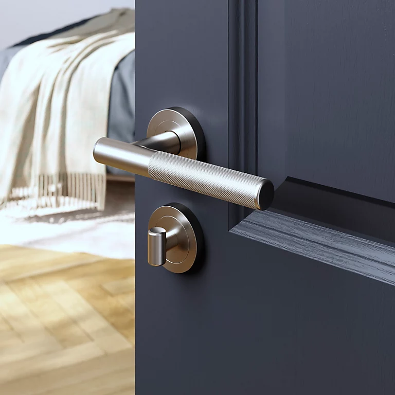 - Disponible en plusieurs finitions, cette poignée de porte sur rosace peut être associée à des poignées et des boutons de meuble de la même gamme pour créer un style coordonné